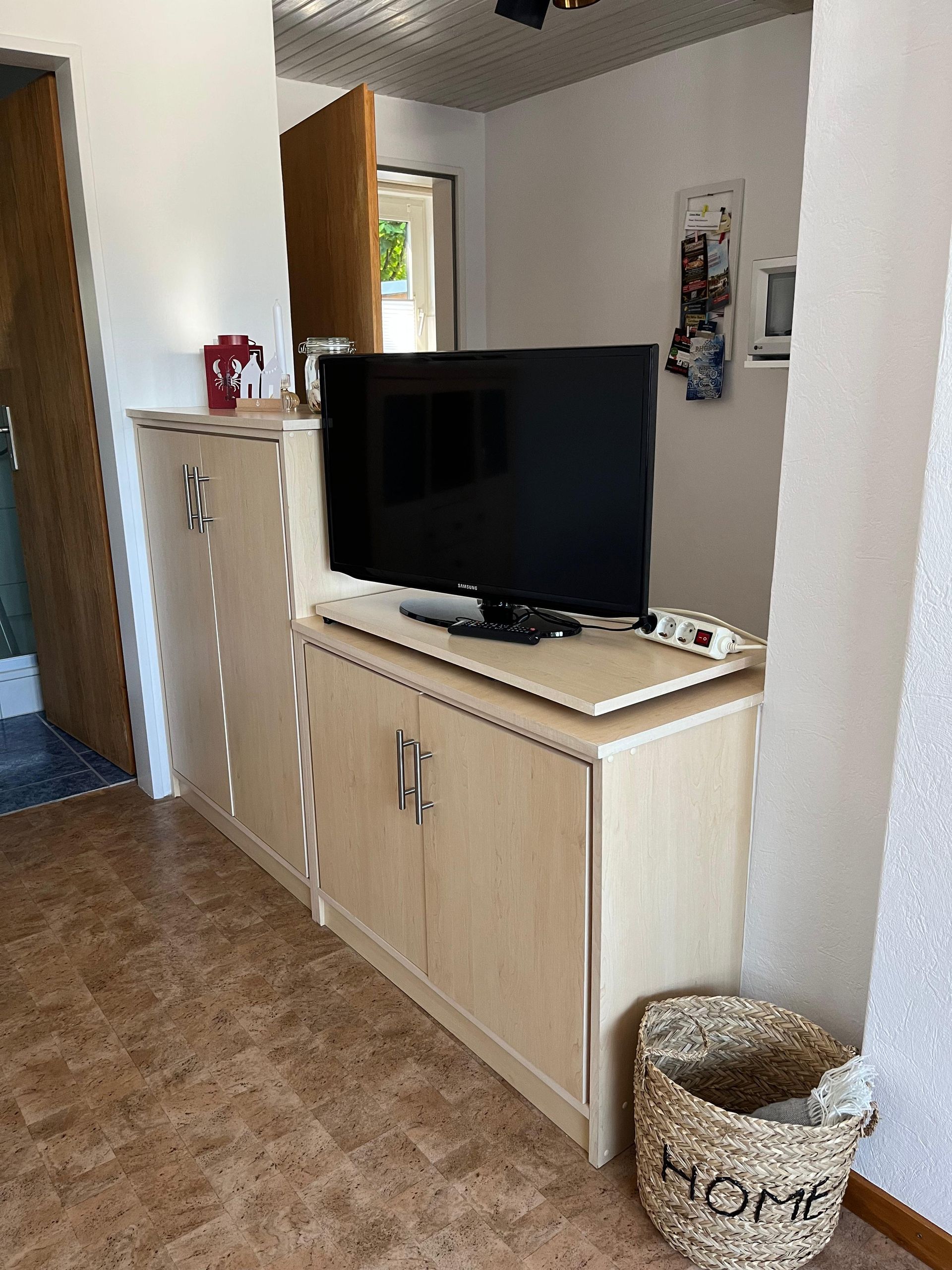 Ein Fernseher, auf dem Sie auch Radio hören können, und WLAN ist in der Wohnung vorhanden.