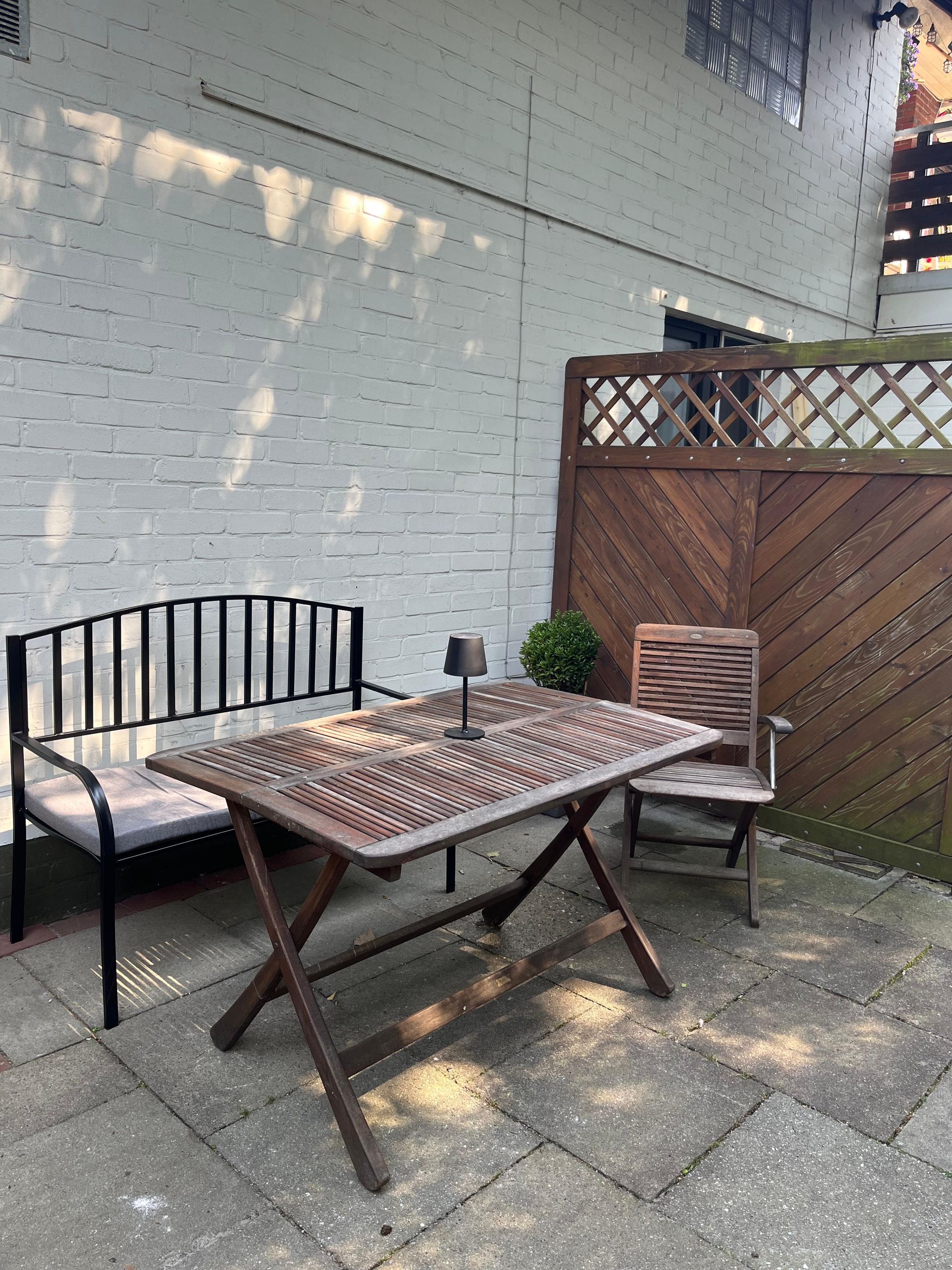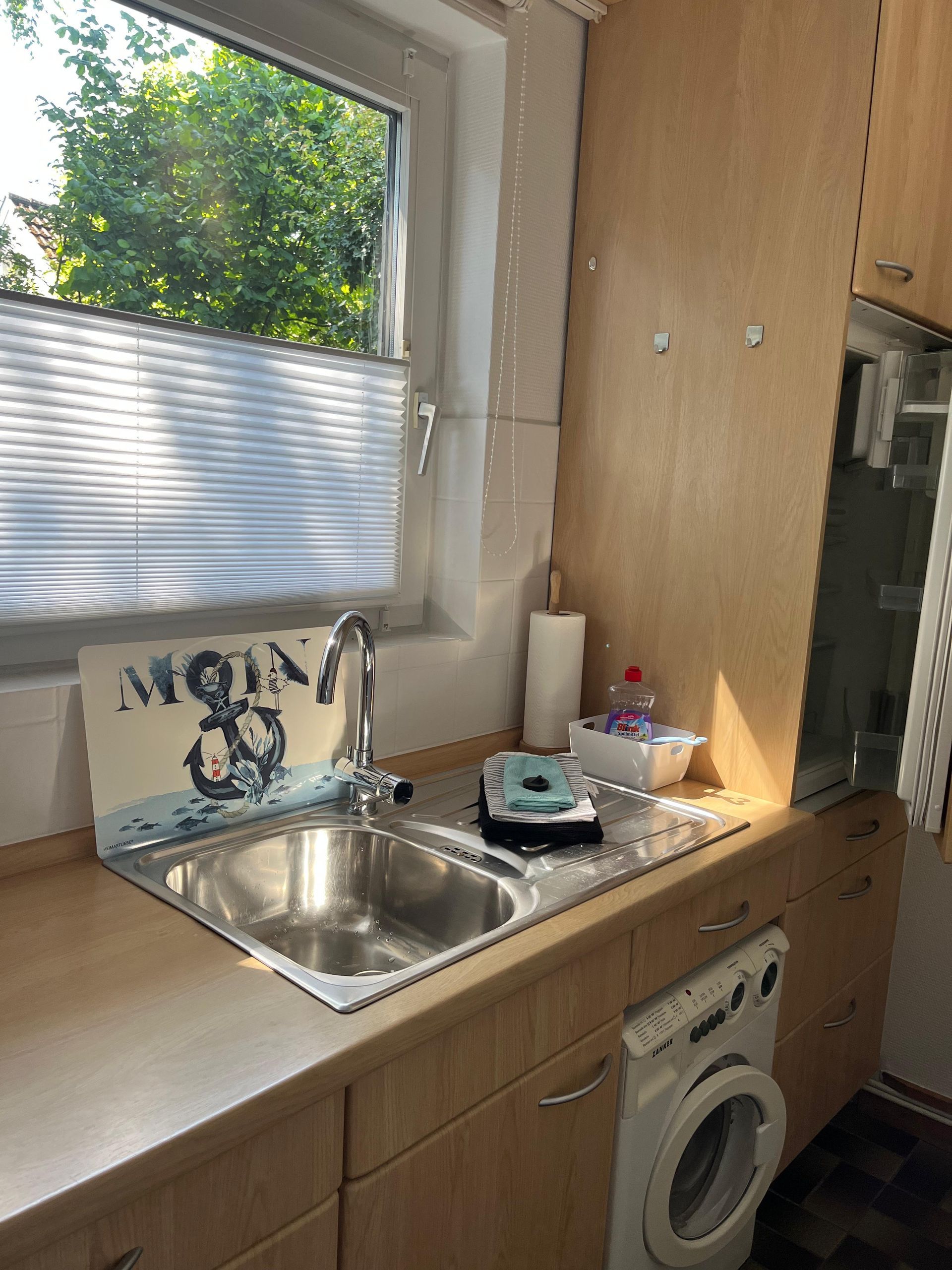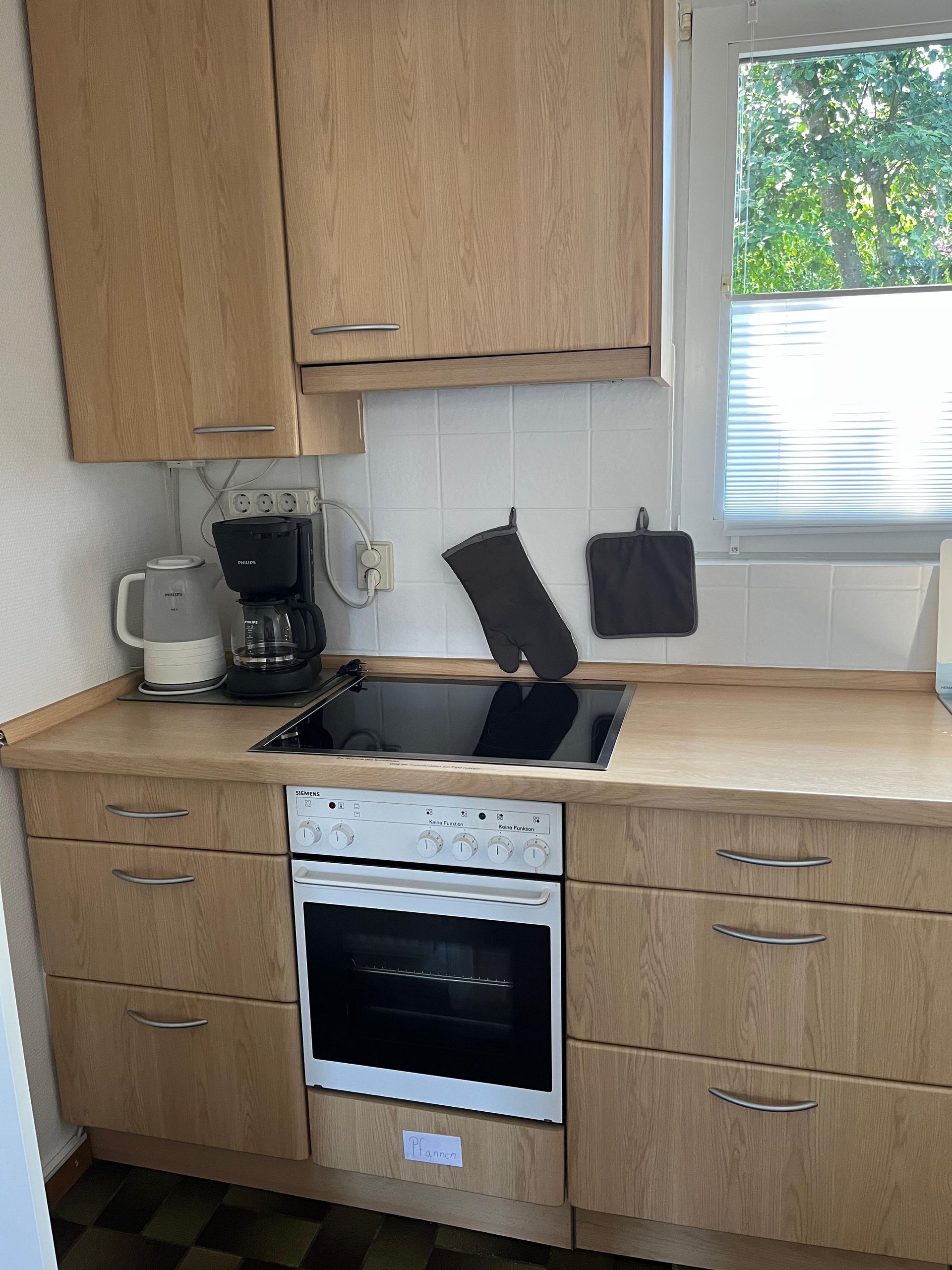 Die Wohnung ist ebenerdig und hat eine kleine Eingangsstufe. Rückseitig befindet sich ein Freisitz, an dem der Dauermieter der ersten Etage vorbei gehen muss. Neben einer komplett ausgestatteten Küche, einem Badezimmer und einem geräumigen Wohnzimmer haben wir ein abgeschlossenes Schlafzimmer. Das Schlafzimmer verfügt über ein Doppelbett und aufgrund der Größe passt ein Kinderreisebett mit in das Zimmer.